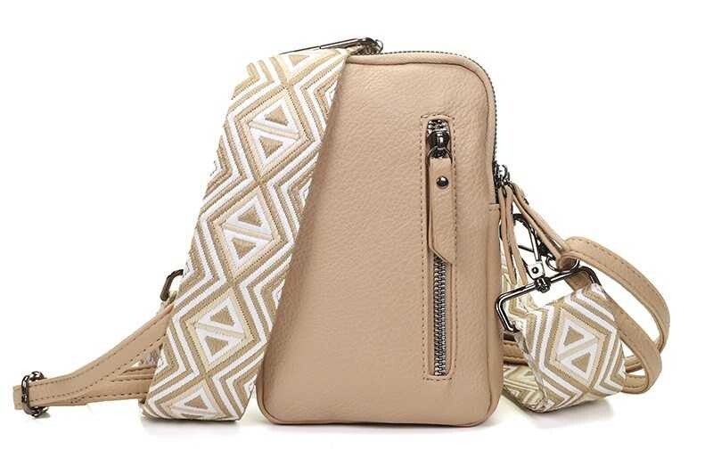 Het tasje heeft een vak aan de voorkant die perfect dient om een telefoon in op te bergen. In het midden heb je twee verschillende vakken apart afsluitbaar met een ritsje voor het opbergen van b.v. portemonnee, sleutels enz. Aan de achterkant zit nog een verticaal vak met ritsje Perfect voor pasjes of muntgeld.