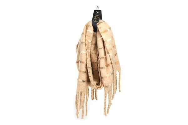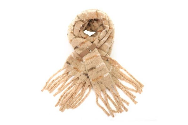 Zacht en Grafisch Design: Het subtiele streeppatroon geeft de sjaal een levendige en interessante look, terwijl de dikke, robuuste franjes zorgen voor een speels en afgewerkt geheel.