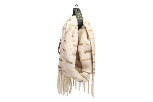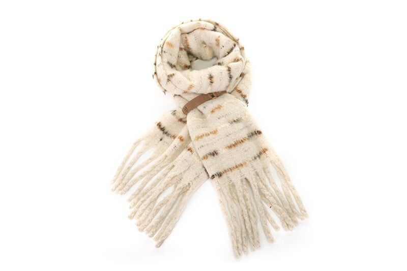 Zacht en Grafisch Design: Het subtiele streeppatroon geeft de sjaal een levendige en interessante look, terwijl de dikke, robuuste franjes zorgen voor een speels en afgewerkt geheel.